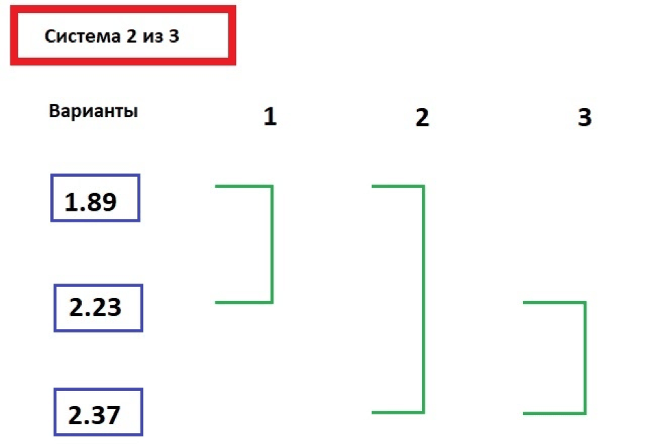 Попрактикуемся на самом элементарном типе системы 2 из 3 и посчитаем выигрыш при всех возможных вариантах развития событий.