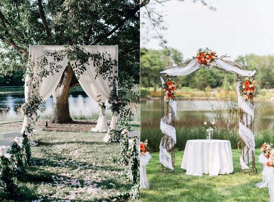 Хочешь чего-то нового? Есть арки в форме сердца, прямоугольные, квадратные, сделанные из прутьев деревьев и в форме шалаша. Отлично послужит аркой красивая альтанка или беседка возле озера. Арка из книг, в форме дверей, даже большое дерево украшенное цветами и вашими фото может стать отличной заменой традиционной. Оформление играет важную роль во всей церемонии. Как правило, площадку для проведения украшают всевозможными цветами и цветочными композициями, лепестками, фигурками сердечек и другой романтической атрибутикой. Актуальными являются украшения из бумаги — цветы, помпоны, гирлянды, веера, журавлики.