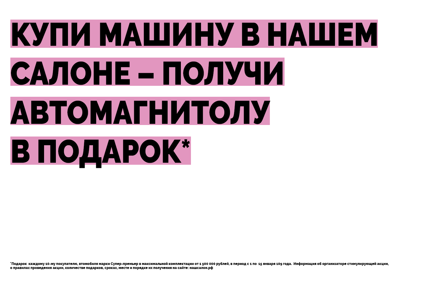В яркой части рекламы есть условие: купи машину — получи автомагнитолу. Условие звучит так, будто каждому покупателю салона дарят магнитолу. Но мелким шрифтом: «магнитолу получает каждый десятый покупатель машины марки „Супер-премьер“ в максимальной комплектации за 1 500 000 рублей». Так нельзя.