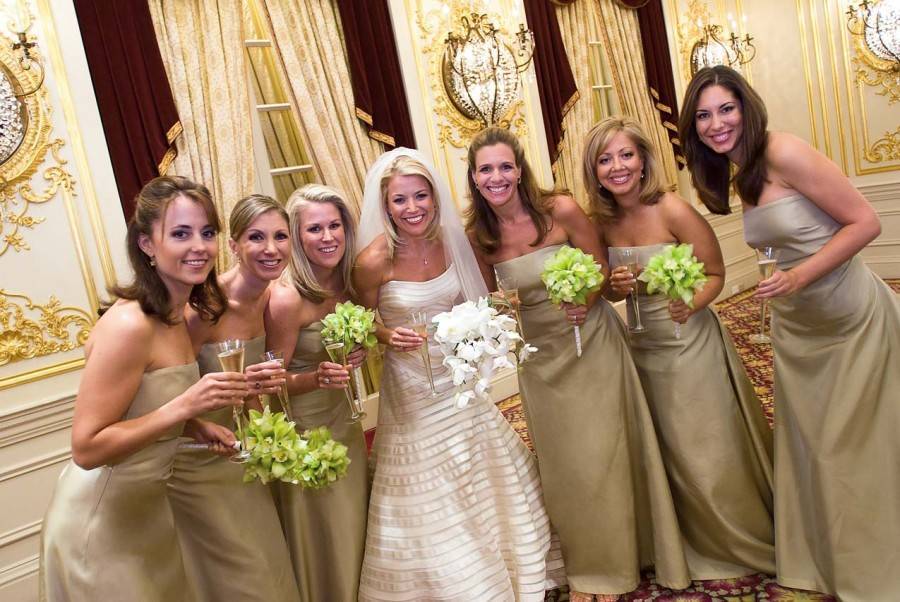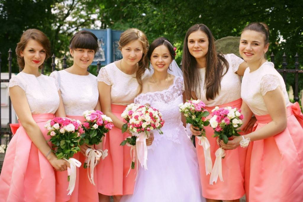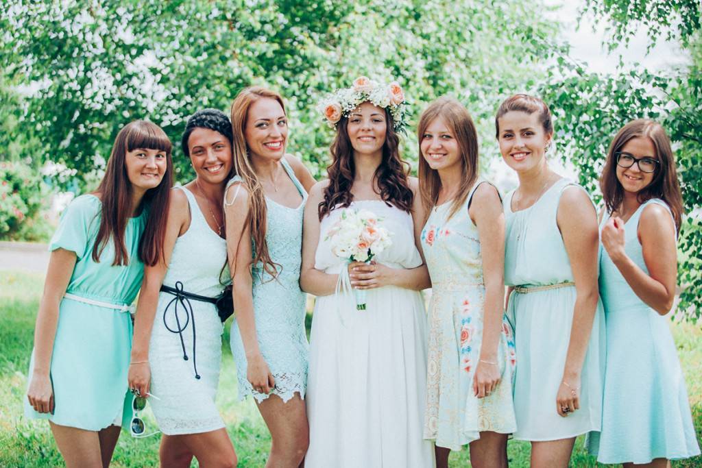 Туфли должны быть закрытыми в виде лодочек либо традиционные балетки. Дополнить и разнообразить женский образ следует ювелирными украшениями или дорогой бижутерией, маленькой сумочкой и небольшой диадемой в волосах, кружевными перчатками и чулками с подвязкой. Букет невесты, а также ее подруг должен быть из небольших полевых цветов или маленьких роз.