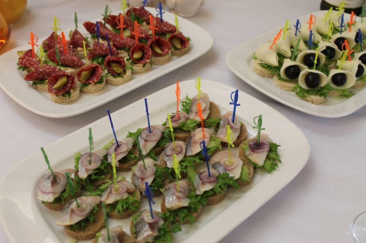 Крайне важно красиво оформить нарезку и бутерброды, так как фуршетный стол – это, в первую очередь, эстетика. Во время торжества гостям предлагаются в основном холодные закуски: канапе, миниатюрные порции разнообразных салатов, тарелки с нарезками, закуски на шпажках