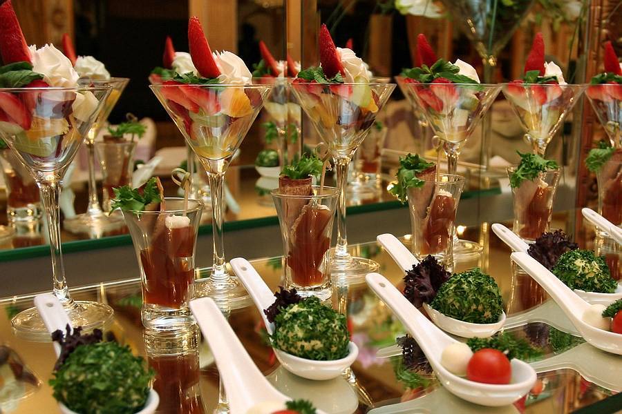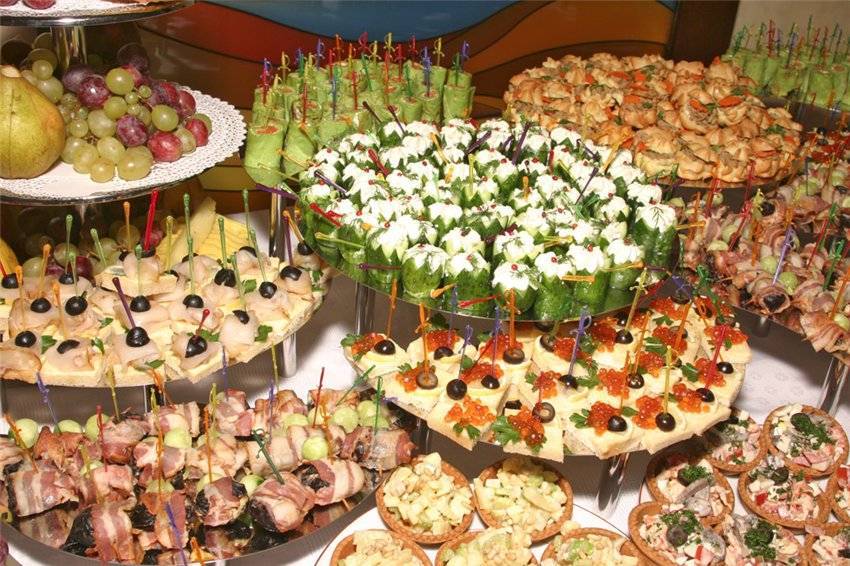 - Меню – обязательно множество разнообразных холодных закусок, порционных горячих закусок, десертов, напитков.