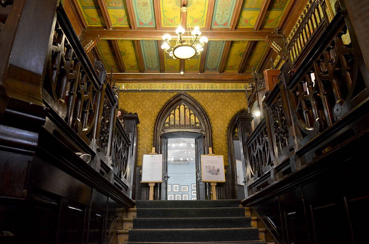 - Вестибюль. С начала XX в. обстановка музея изменилась, и единственным, на что не повлияло время, остался вестибюль с тяжелыми дверями, резьбой по дереву, витражами и расписным потолком. Здесь находятся 2 витрины, правая из которых повествует о семье мецената, а левая – о создании музея и его первых годах.