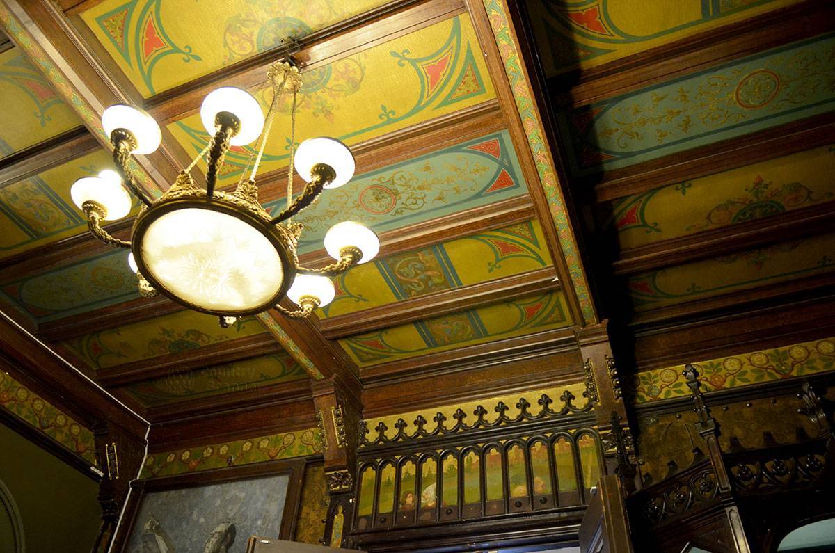 Еще с нижних ступеней лестницы внимание привлекает узорчатый потолок помещения. Поднявшись, можно разглядеть этот элемент здания более внимательно