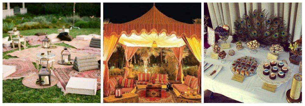 Лучше всего для этой темы подойдет именно поздний вечер, когда солнце сядет за горизонт, и окончательно стемнеет вокруг. Для организации самого пространства вам понадобится шатер (его можно соорудить из нескольких воздушных кусков ткани), многочисленные подушки и пледы, ведь ночью может сильно похолодать. Роль горячих факелов на себя возьмут свечи и подвесные фонарики.