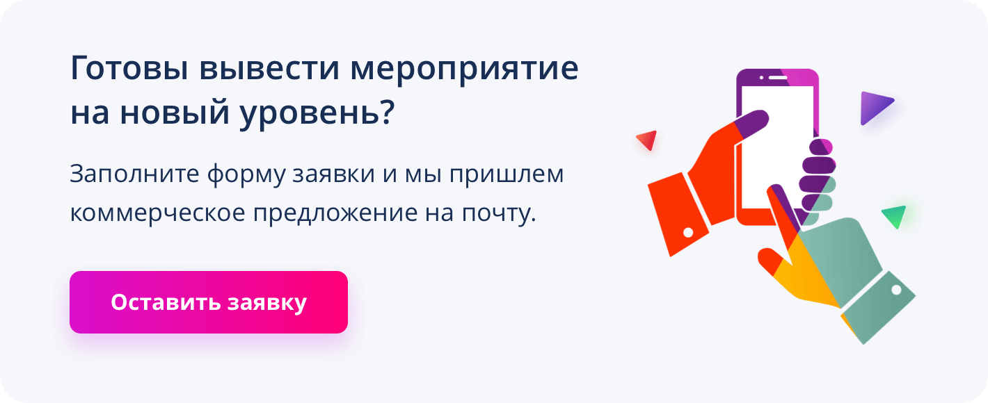 Будут востребованы технологии, позволяющие максимально сократить дистанцию между выступающими, гостями и онлайн-зрителями. Чем большего эффекта присутствия удастся достичь, тем больший успех вам обеспечен. Дистанция между сценой и зрителями сокращается: позвольте аудитории принимать решения, задавать вопросы.