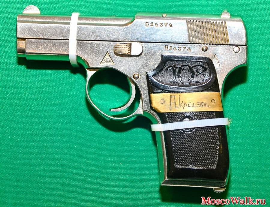 Пистолет самозарядный ТК образца 1926г. системы Коровина. Принадлежал Герою Советского Союза А.Е. Клещёву, командиру партизанского соединения Пинской области Белоруссии в период Великой Отечественной войны.