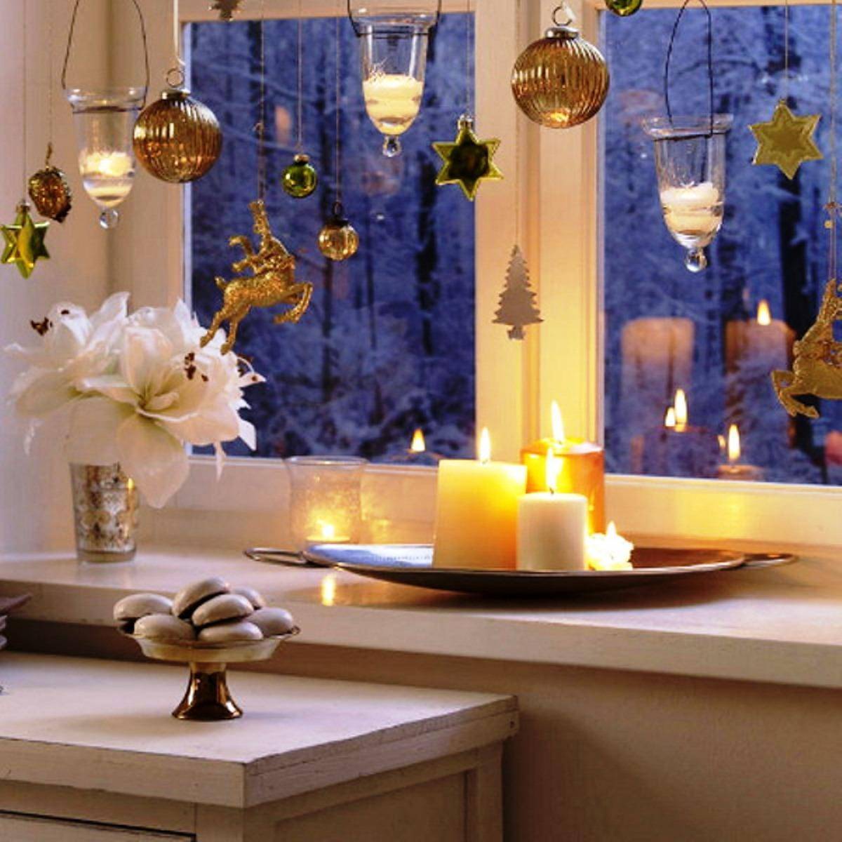 Нередко именно на подоконнике создают уникальную тематическую композицию. На подставу или поднос поместите шишки, еловые веточки, установите свечу в стеклянном подсвечнике. При желании можно добавить и другие детали.