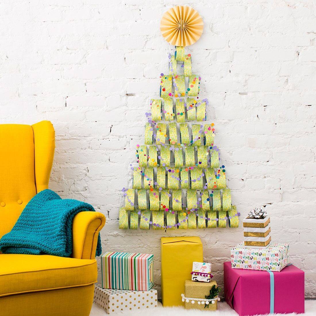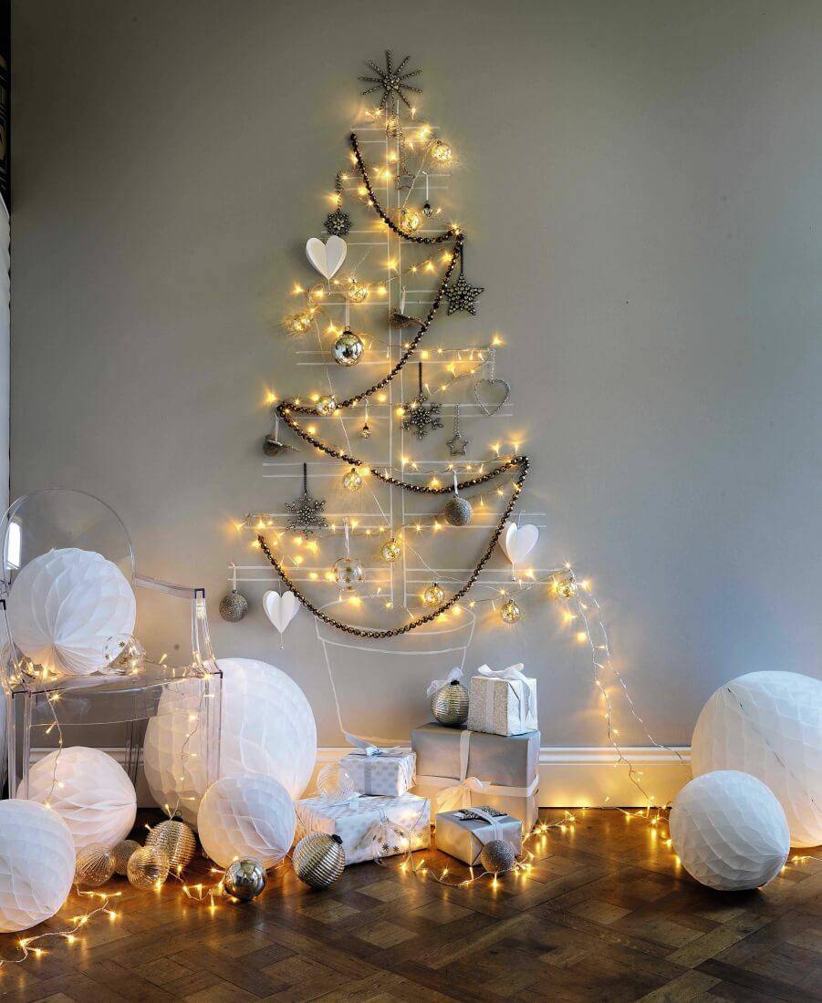 Что касается стен и потолка, то их оформление не должно быть слишком активным. Впрочем, если вы не планируете устанавливать елку, можно сделать ее на одной из стен. Она может выглядеть совершенно по-разному, в зависимости от выбранных материалов. В основном елку делают из деревянных палок, веток, мишуры и даже бумаги. Каждый вариант смотрится по-своему интересно, поэтому выбирайте тот, что вам по душе.