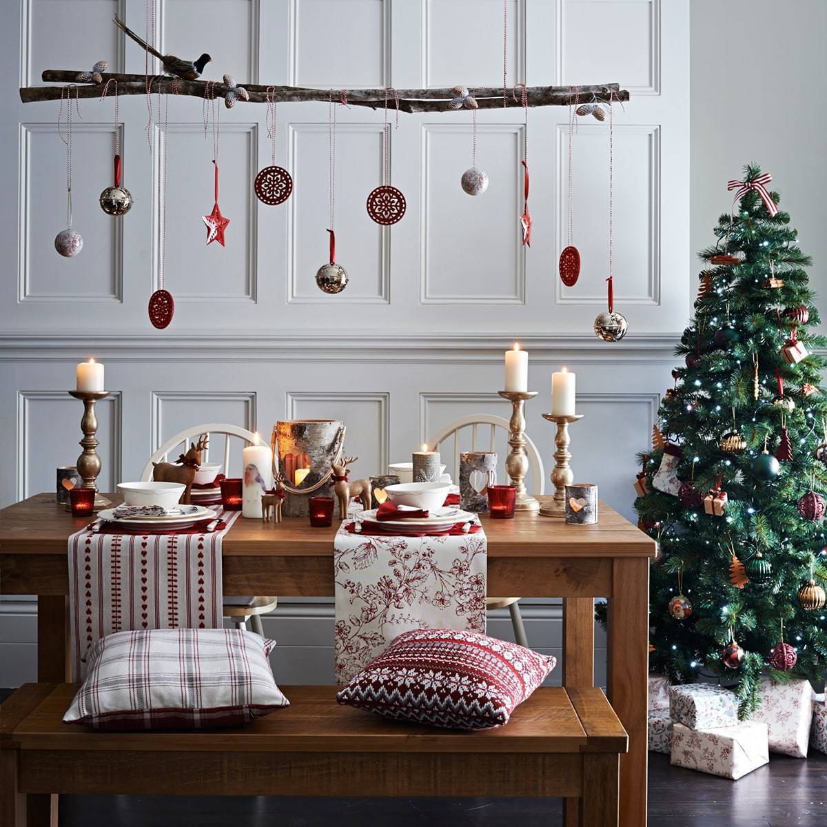 Ностальгические красные, белые и зеленые цвета елочных украшений по-прежнему в моде. А вот от мишуры и дождика лучше отказаться – естественную красоту зеленой хвои или простых веток подчеркнет настоящий снег.