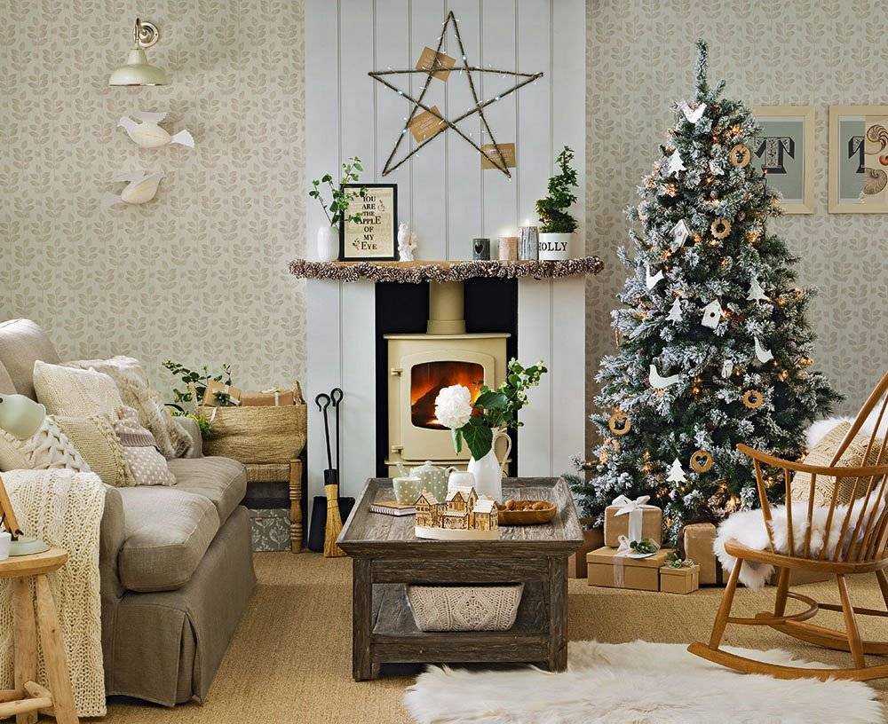 По прежнему популярен эко стиль. Он отлично подходит для частного домовладения, сближает с природой. В этом направлении отсутствует вычурность, а новогодние элементы декора легко смастерить своими руками.