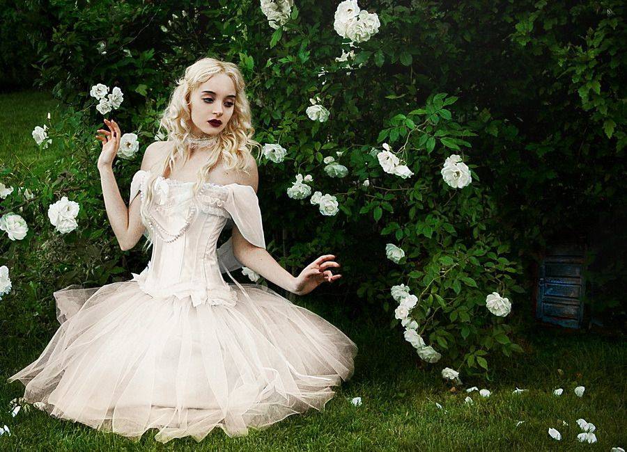 Как вы помните, главными цветами в книге были розы. Те самые белые розы, которые Алиса предложила выкрасить красной краской. Есть сорт двухцветных, бело-красных роз «Императрица Фарах»; но найти их будет сложно. Почему бы не пойти по пути, который был предложен Кэрроллом? – Покрасить белые цветы красной краской.