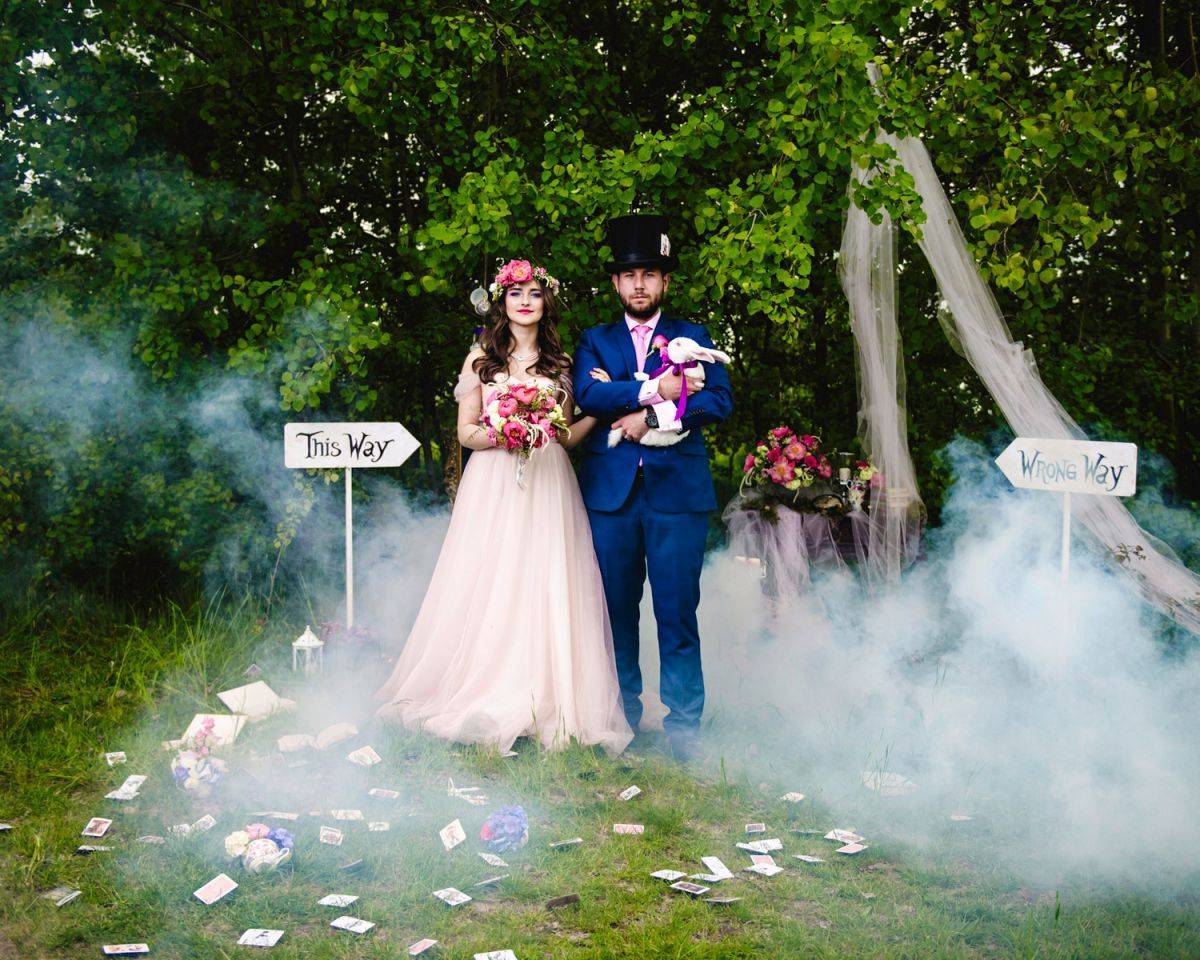 Молодым необходимо суметь объединить в образе черты фэнтези и английского стиля XIX века: классические модели в сочетании с нежными цветами и лентами. Невесте отводится роль Алисы, а жениху – безумного Шляпника или Чеширского Кота.