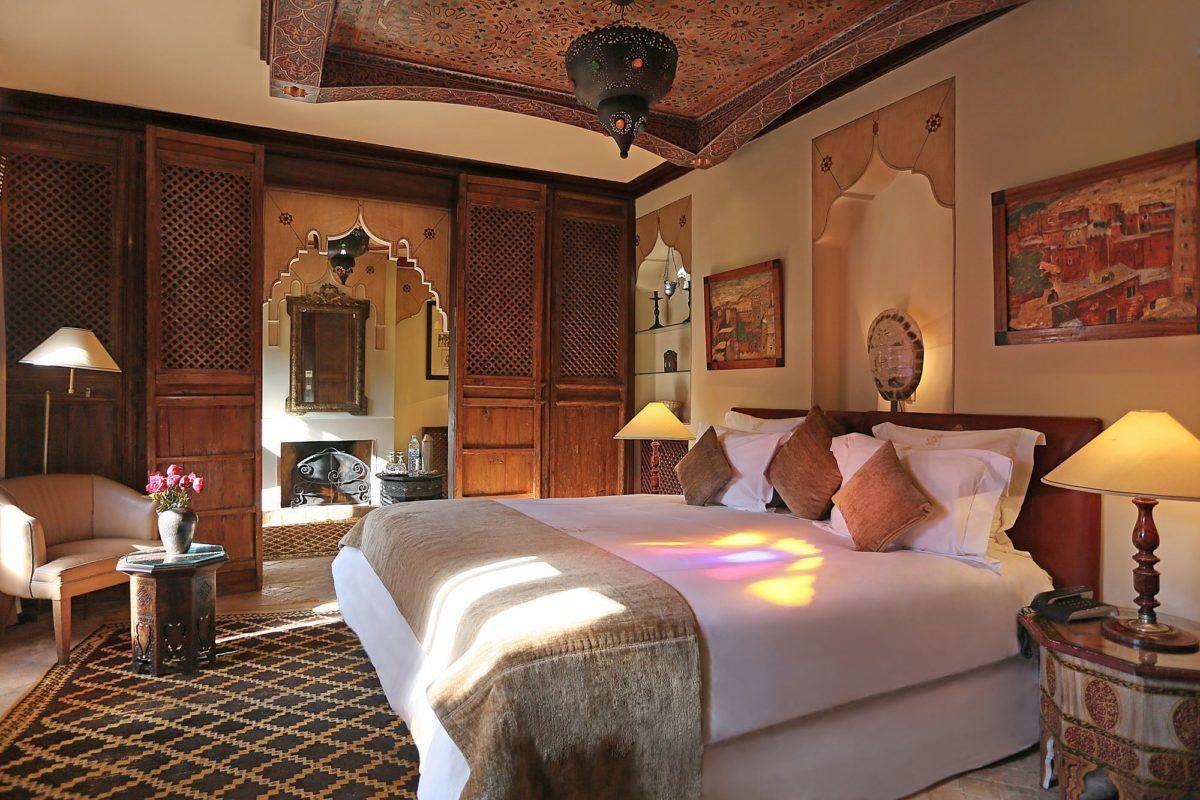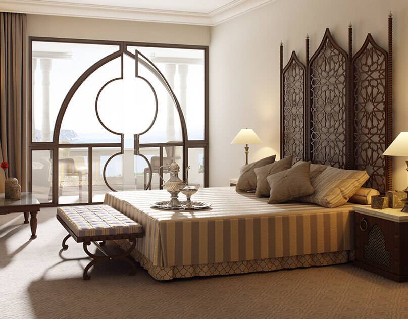 1. В арабской спальне главное место отводится кровати. Обычно она невысокая, широкая, мягкая. По углам – высокие резные деревянные столбики, предназначенные для балдахина. Он похож на шатёр, изготавливается из тканей, которые хорошо и дорого драпируются: бархат, шёлк, органза. Альтернатива балдахину – полог, накрывающий часть кровати.