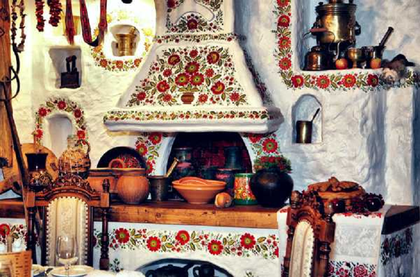 Поскольку интерьер с украинской стилистикой создается в квартире, то он имеет право сочетать в себе характерные черты и современный подход. Можно применить в отделке стен мозаичное панно с растительным принтом. Нежелательно отклоняться от требуемых оттенков – белого или бежевого в качестве фона, и красного, черного, коричневого или другого яркого в узоре.