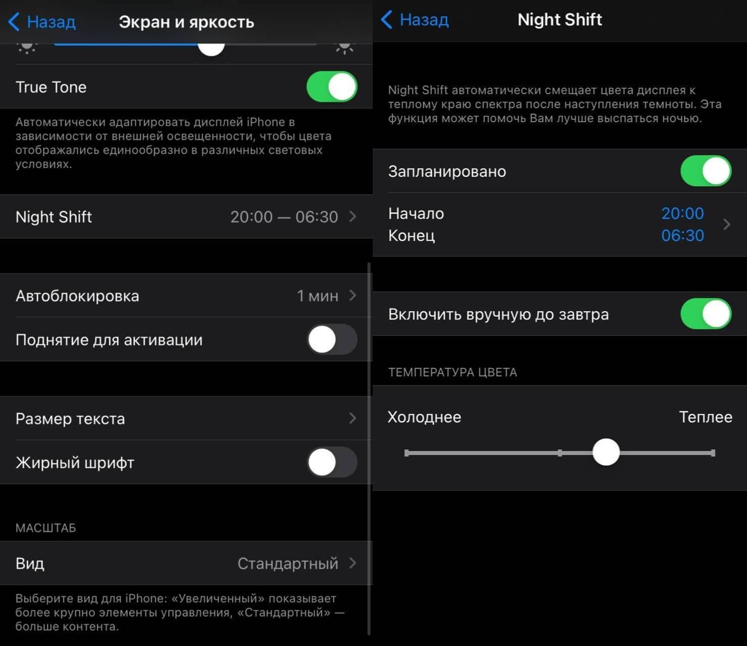 Режим Night Shift можно и нужно настраивать, регулируя цветовую температуру дисплея. Зайдите в Настройки, нажмите «Экран и яркость», выберите Night Shift. Передвиньте ползунок вправо, если хотите, чтобы цветопередача была теплее. Чем теплее, тем полезнее будет для ваших глаз в темное время суток. Можно передвинуть влево, чтобы свечение было холоднее. Помните, что чем холоднее цветопередача, тем меньше в настройке смысла. Двигайте ползунок правее и не бойтесь дискомфорта — привыкнете к желтоватому экрану в считанные минуты, пока пользуетесь приложением. А вы пользуетесь Night Shift? Расскажите в нашем Telegram-чате свое отношение к этой функции.