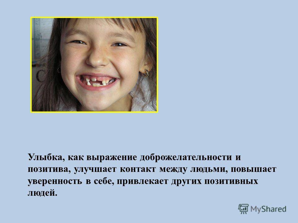 Улыбка, как выражение доброжелательности и позитива, улучшает контакт между людьми, повышает уверенность в себе, привлекает других позитивных людей.
