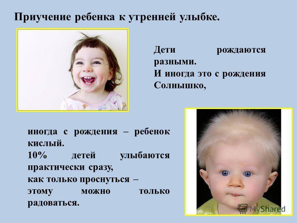 Приучение ребенка к утренней улыбке. Дети рождаются разными. И иногда это с рождения Солнышко, иногда с рождения – ребенок кислый. 10% детей улыбаются практически сразу, как только проснуться – этому можно только радоваться.