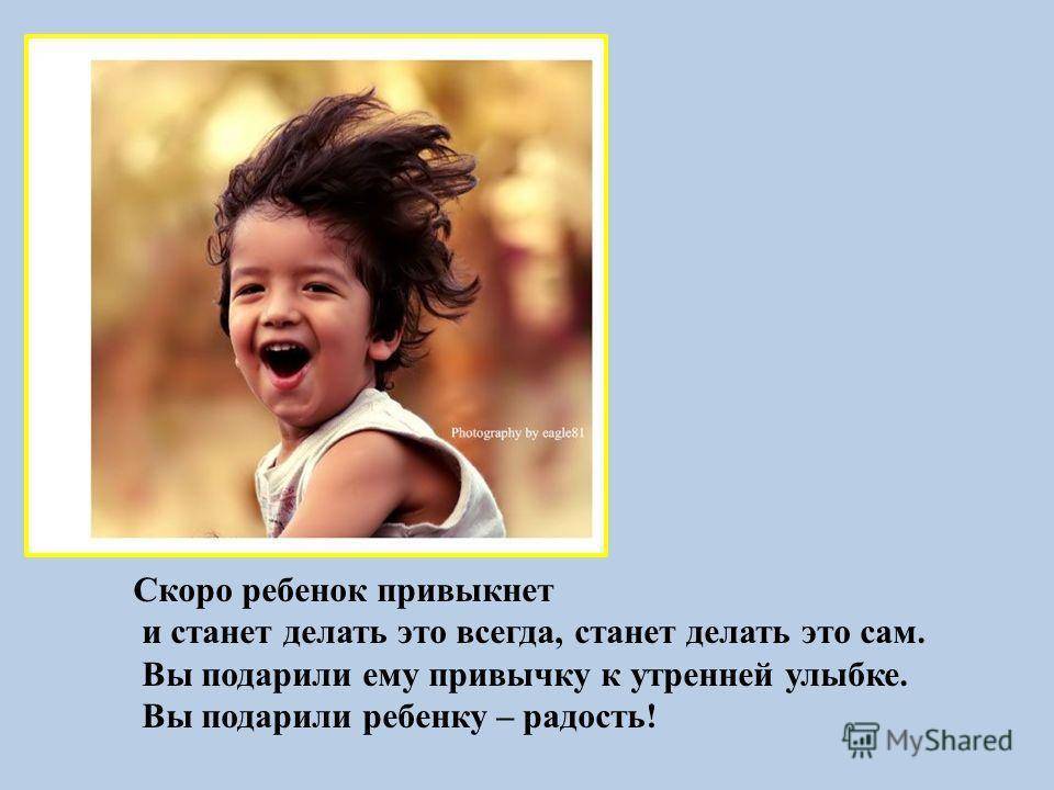 Скоро ребенок привыкнет и станет делать это всегда, станет делать это сам. Вы подарили ему привычку к утренней улыбке. Вы подарили ребенку – радость!