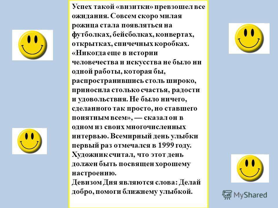И еще именно Харви Бэлл стал инициатором организации праздника посвященного улыбке. И, несмотря на то, что история возникновения праздничного символа берет свое начало с начала 60-х, сам праздник стали отмечать только в 1999 году.