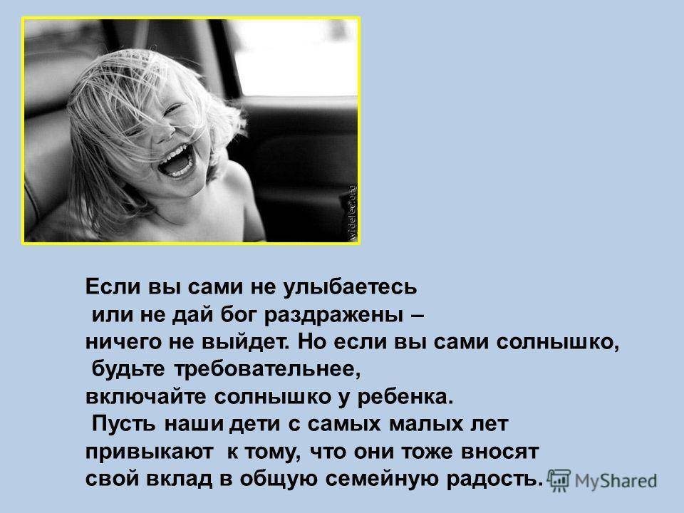 Если вы сами не улыбаетесь или не дай бог раздражены – ничего не выйдет. Но если вы сами солнышко, будьте требовательнее, включайте солнышко у ребенка. Пусть наши дети с самых малых лет привыкают к тому, что они тоже вносят свой вклад в общую семейную радость.