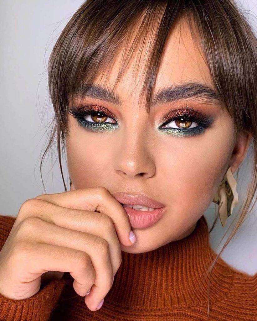 Карие (ореховые) глаза, светлая кожа удачно сочетаются с такими цветами, как ярко-голубой, зеленоватый, морской, цвет фуксии. Старайтесь избегать оранжевых оттенков, крайне редко получаются удачные сочетания, хотя идеи отдельных визажистов придают образу свежесть и неординарность.