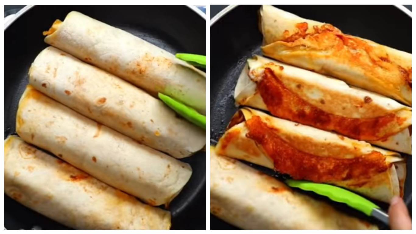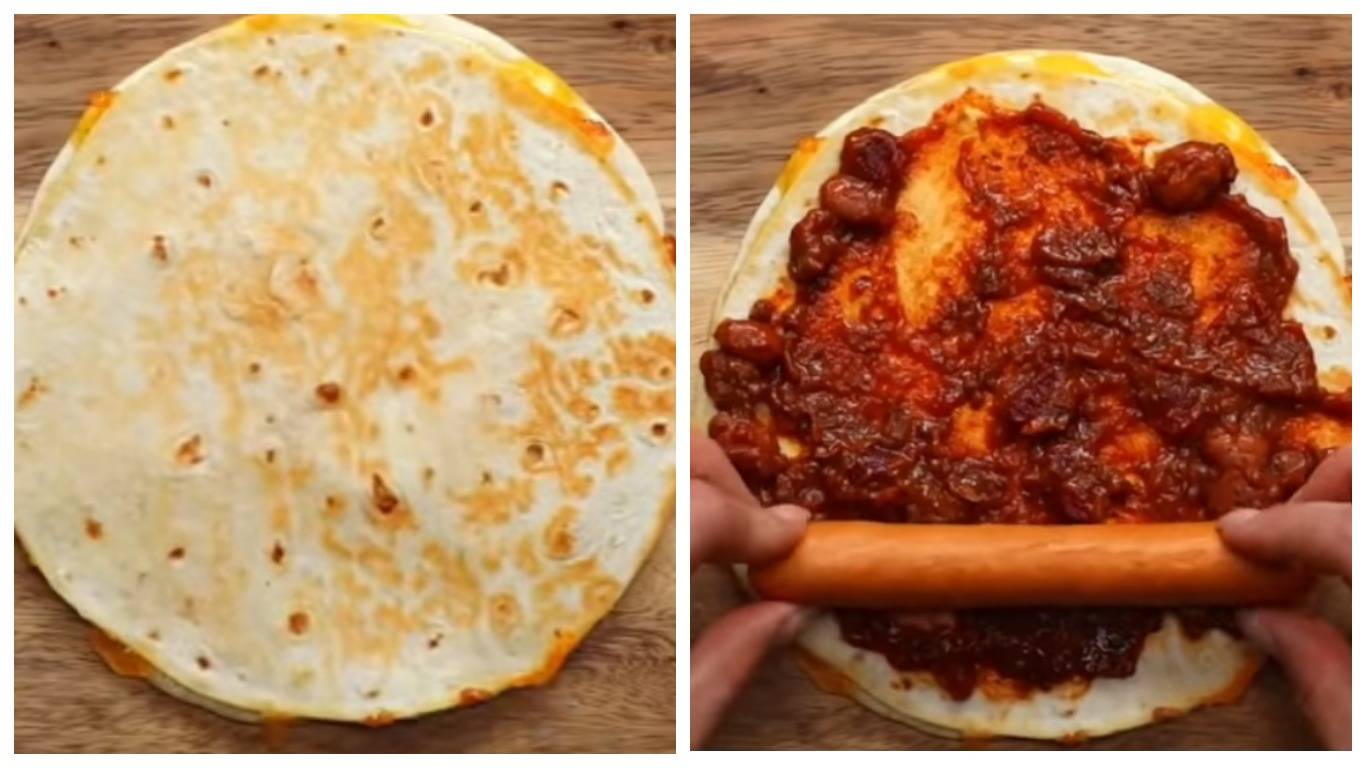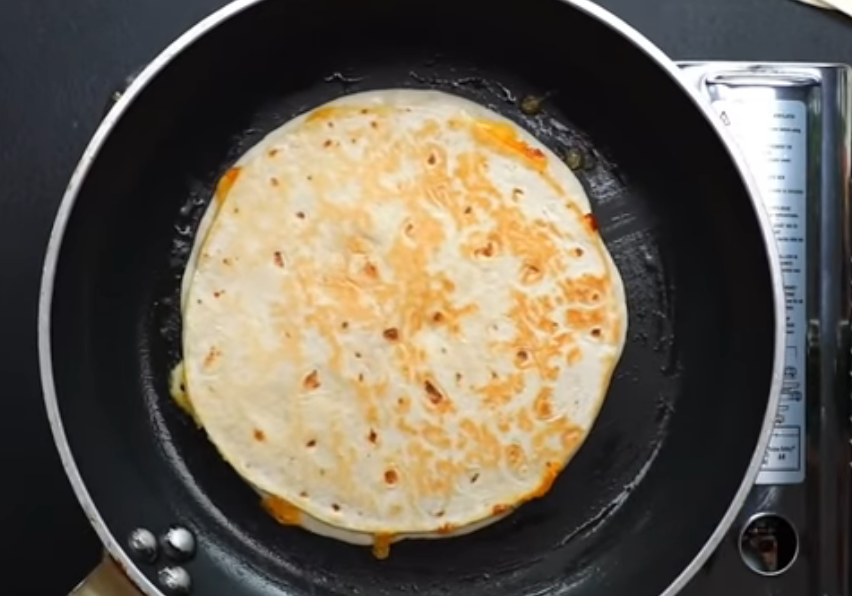 На горячую сковородку положите одну лепешку. Посыпьте тертым чеддером. Покройте второй лепешкой. Жарьте с двух сторон. Сыр расплавится, а лепешки приклеятся друг к другу.
