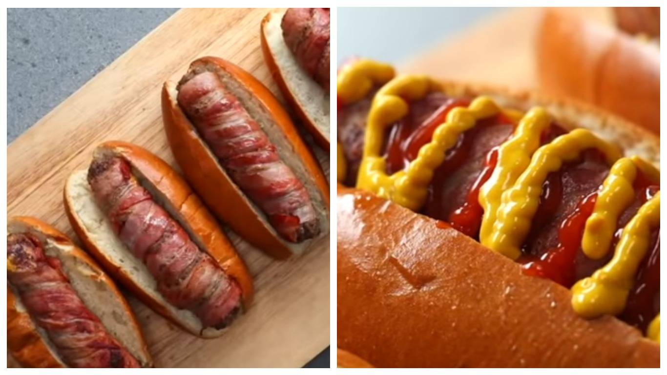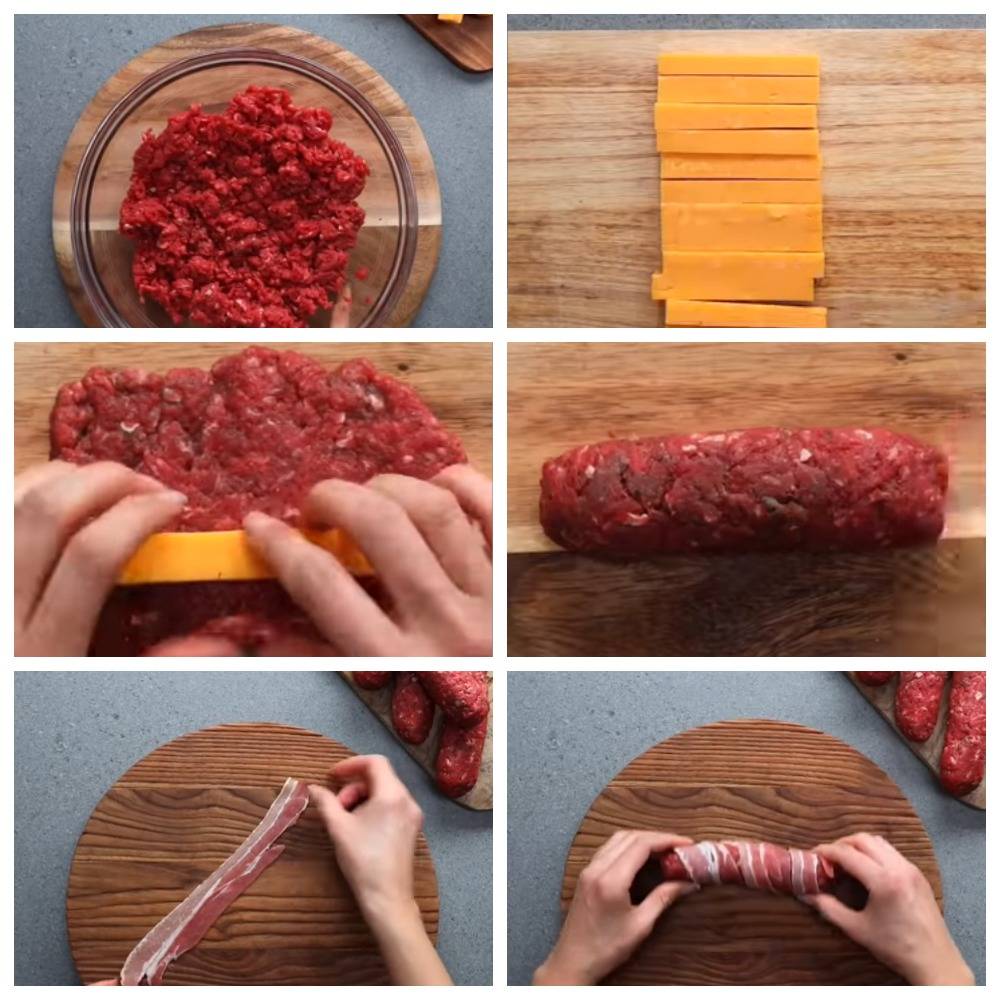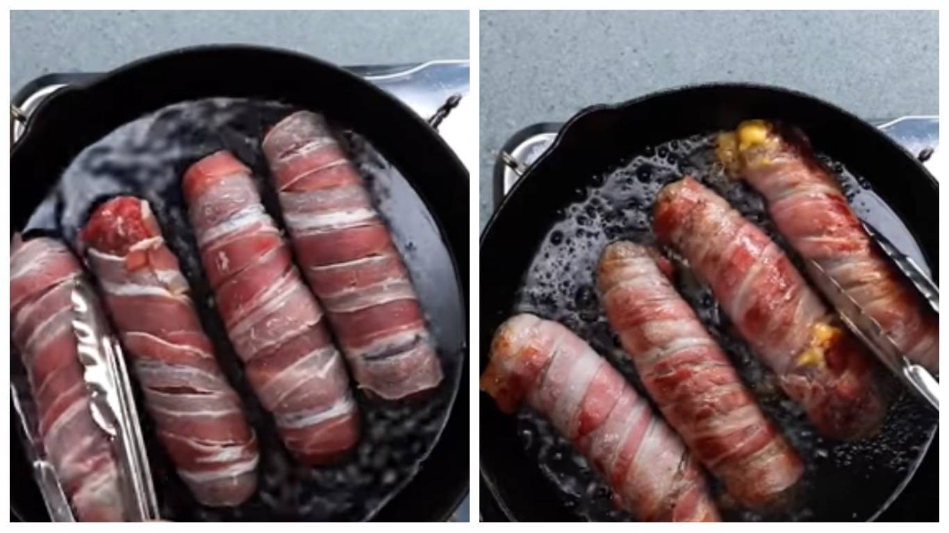 Фарш тщательно перемешайте с яйцом, солью, перцем. По 2 столовые ложки выкладывайте на разделочную доску. Разминайте в лепешку. В нее заверните брусок сыр. Сформуйте форму сосиски. Каждую заверните в полоску бекона. Пожарьте на сковороде до готовности.