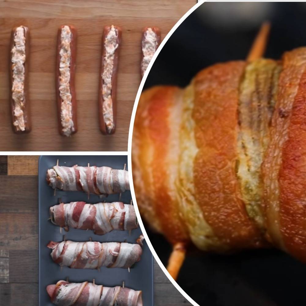- Оберните полосками бекона. Зажмите зубочистками. Уложите на противень.