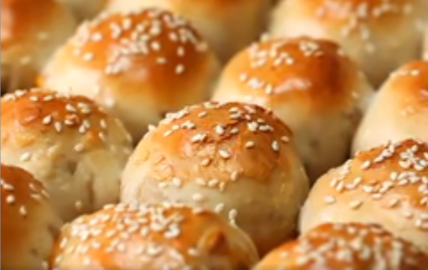 - Выложите на противень. Смажьте желтком. Сверху посыпьте солью. На каждый пирожок по щепотке.