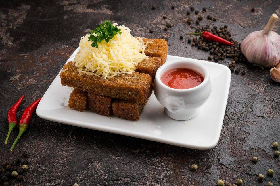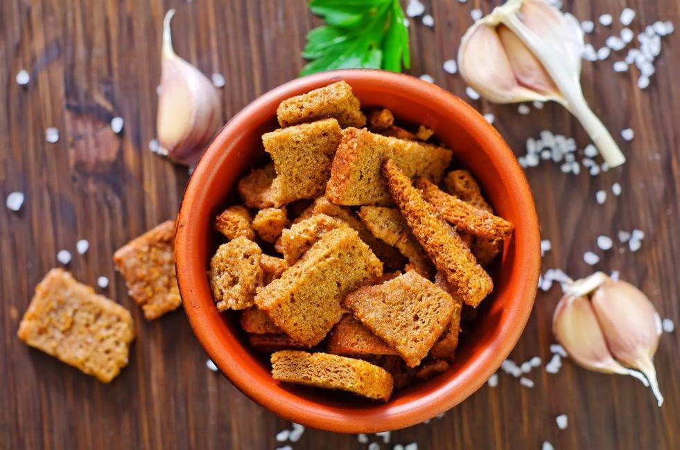 Плотный хлеб («Бородинский», «Дарницкий», «Нарезной») освобождаете от корочки, режете брусочками. Я делаю на сухой сковородке, но предварительно кисточкой для смазывания теста щедро сдабриваю брусочки со всех сторон топленым маслом. Быстро обжарить, сбрызнуть смесью чеснока, соли и воды.