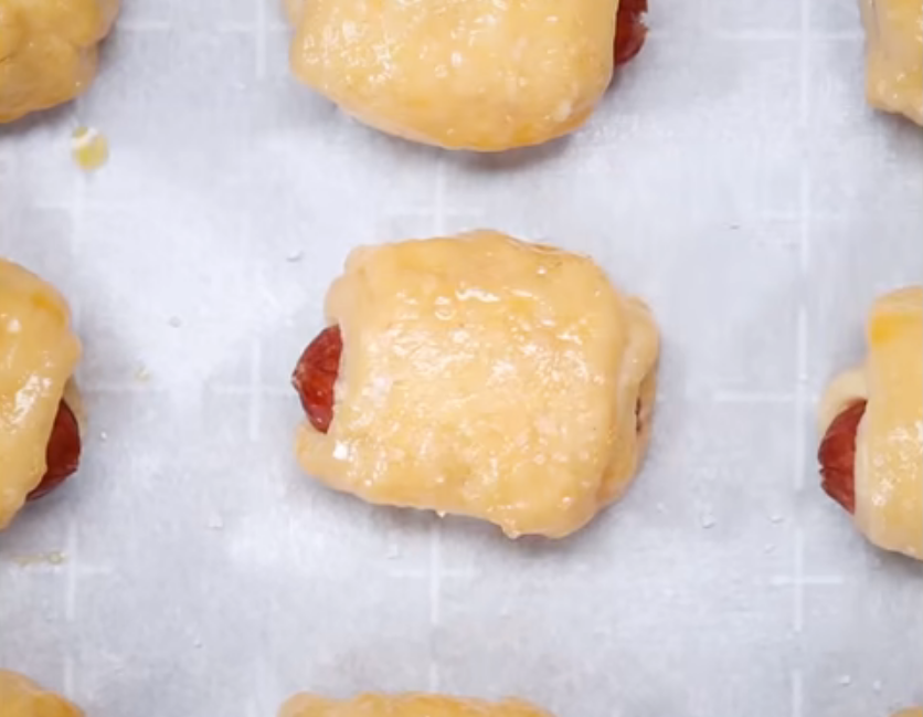 - Мягкое дрожжевое тесто для пиццы нарежьте полосками. Чуть раскатайте. Оберните каждую сосиску полоской.