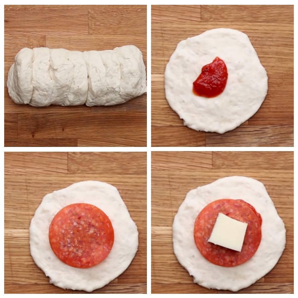 Из комков слепите лепешку. В центр положите по ложке кетчупа. Сверху ломтик колбасы, кубик моцареллы.