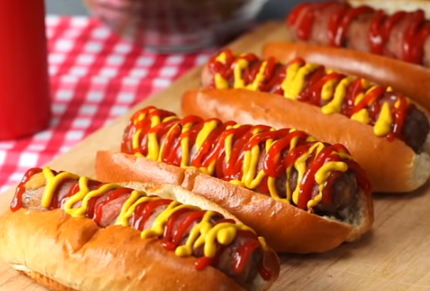 Поместите горячие домашние сосиски в булки. Полейте горчицей и кетчупом.